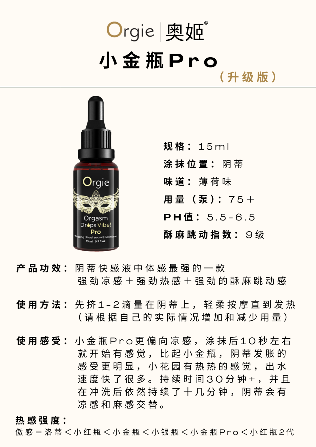 1、Orgie全新高潮液产品,整合了水润凉感,温暖热感和酥麻跳动三重刺激效果,效果翻倍